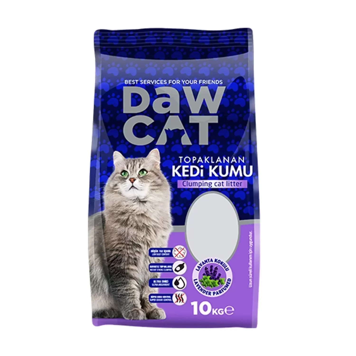Dawcat 10Lt Bentonit Kedi Kumu Lavanta Kokulu, kediniz için özel olarak tasarlanmış hijyenik ve ferahlatıcı bir kedi kumudur.