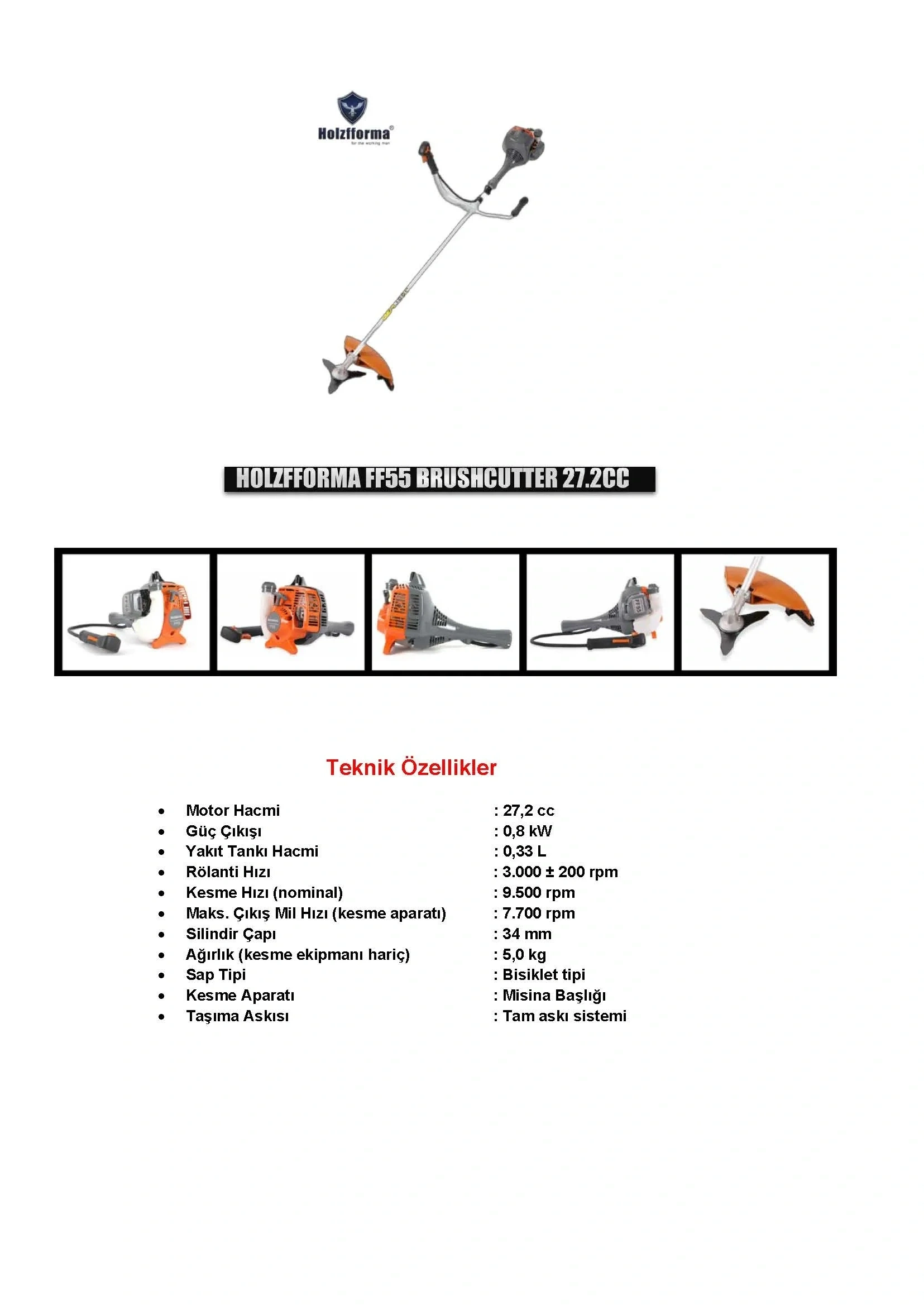 Teknik özellikler: Tırpan makinesi Holzfforma FF55 Çalışma hacmi: 44,3 cu. santimetre Güç: 2,1 kW (3,0 hp) Tank kapasitesi: 0,70 l Rölanti devri: 2.800 dev/dak Kesme hızı (nominal): 12.500 rpm Maksimum. çıkış mili hızı (kesici takım): 8.930 rpm Silindir çapı: 42mm Silindir stroğu: 32 mm Ağırlık (kesme ekipmanı hariç): 8,6 kg Toplam uzunluk: 1765 mm Sap tipi: Bisiklet Kesici alet: Kesici başlık 46-2 Emniyet kemeri: Tam emniyet kemeri