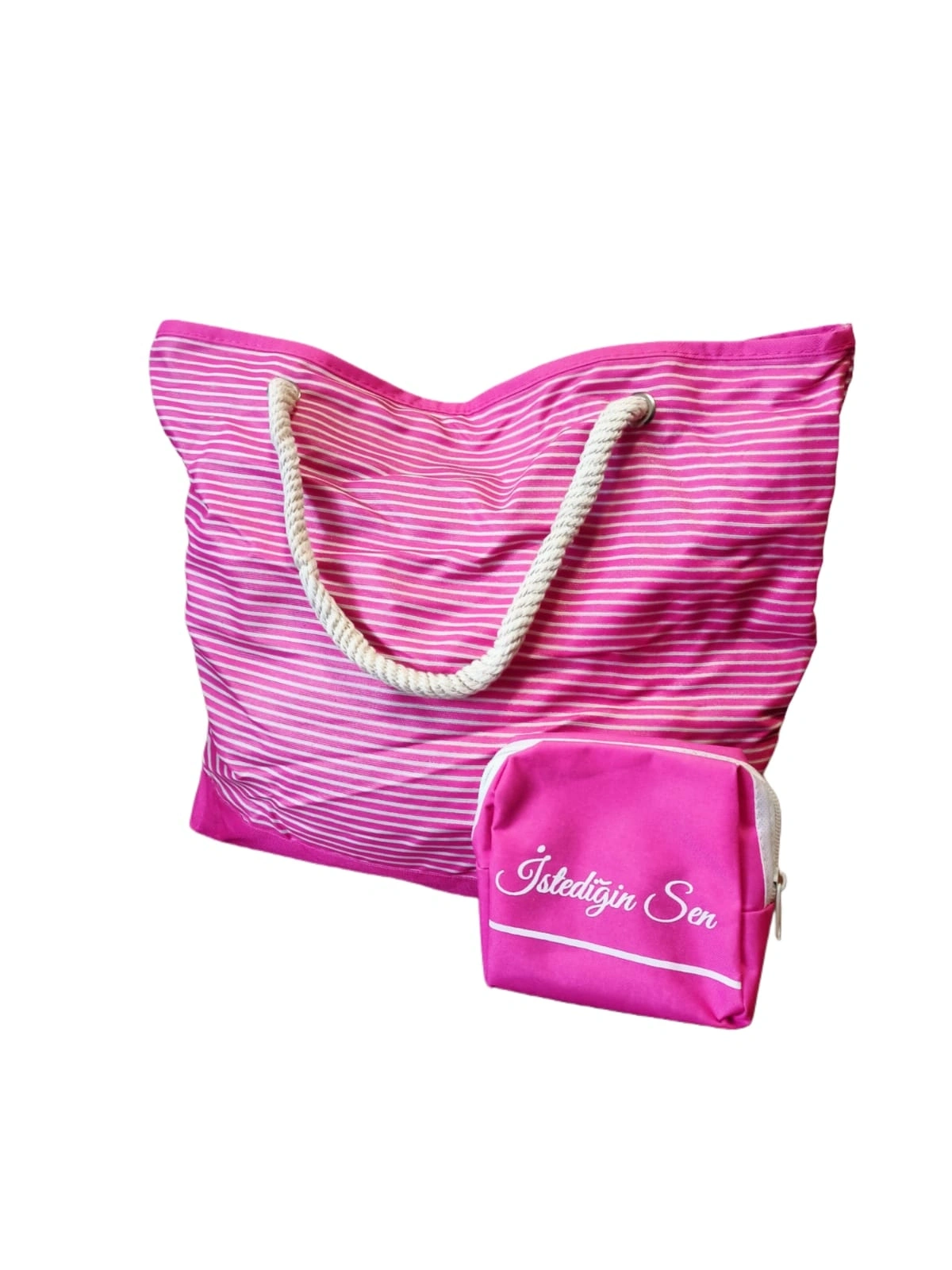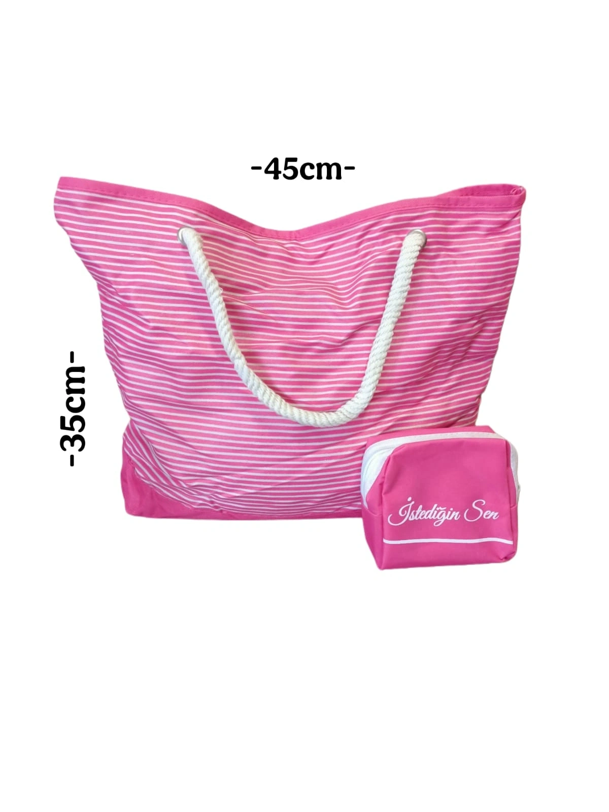 Plaj Çantası Pembe 45 cm – Makyaj Çantası Hediyeli